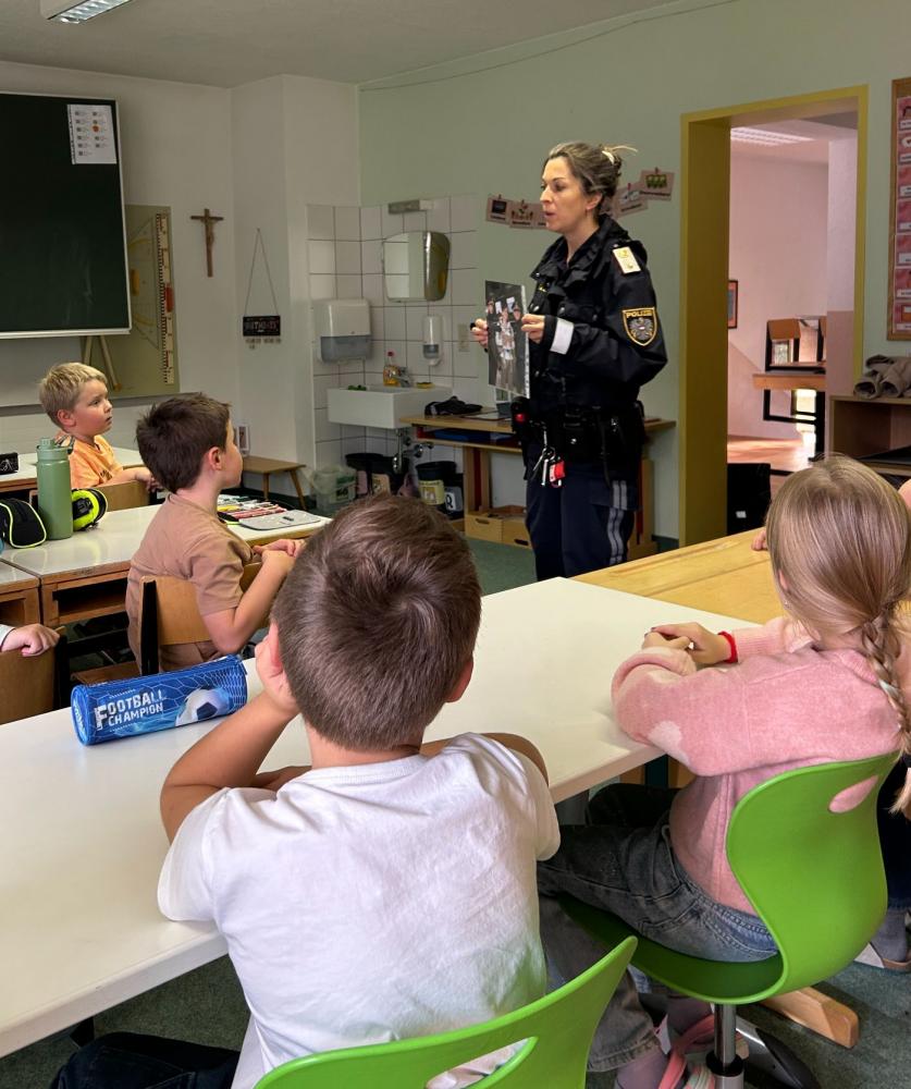 Zu Beginn wurden uns die vielfältigen Aufgaben der Polizei vorgestellt. Im Anschluss lag der Schwerpunkt auf dem Thema Sicherheit am Schulweg. Wir tauschten uns über die Gefahren am Schulweg aus und sprachen über das richtige Verhalten auf der Straße. Dabei wurde uns erklärt, wie bedeutsam es ist, Warnwesten und Reflektoren zu tragen.